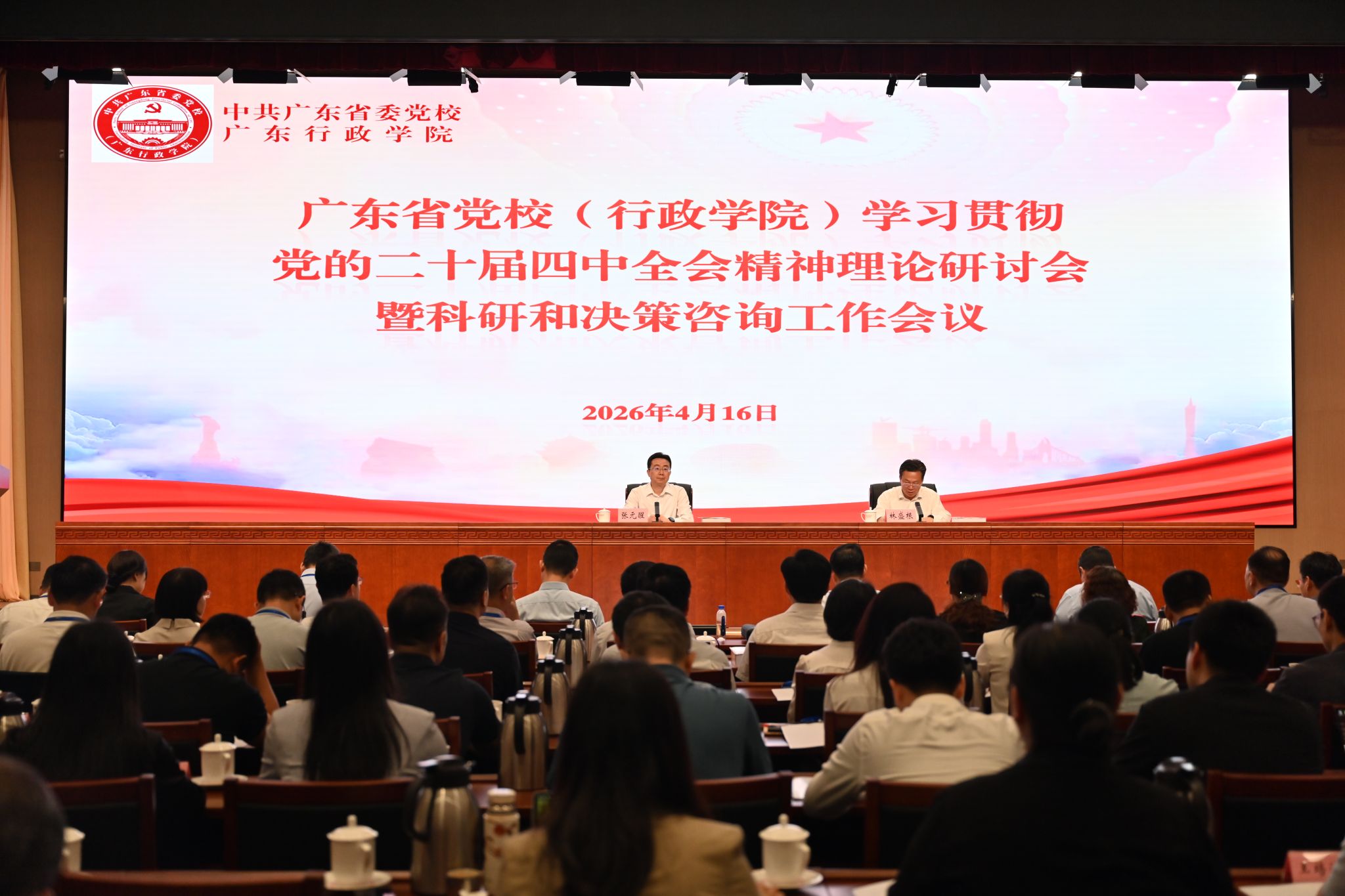 2026年4月16日,广东省党校(行政学院)学习贯彻党的二十届四中全会精神理论研讨会暨科研和决策咨询工作会议在校(院)召开,会议围绕学习贯彻习近平总书记在党的二十届四中全会上的重要讲话和全会精神,以及广东现代化建设走在前、作示范、挑大梁展开交流研讨。常务副校(院)长张元醒出席会议并致辞,副校(院)长林盛根主持会议并作总结讲话。